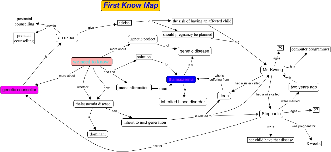 This Concept Map, created with IHMC CmapTools, has information related to: FirstKnowMap1, Stephanie were married two years ago, Stephanie ask for genetic counsellor, solution for thalassaemia, we need to know how thalassaemia disease, thalassaemia is inherited blood disorder, Mr. Kwong ages 29, we need to know more about genetic project, Mr. Kwong had a wife called Stephanie, genetic counsellor is an expert, Stephanie ages 27, Stephanie was pregnant for 8 weeks, an expert give advise, inherit to next generation is related to Mr. Kwong, advise on the risk of having an affected child, inherit to next generation is related to Stephanie, we need to know more about genetic counsellor, we need to know whether thalassaemia disease, two years ago with Mr. Kwong, more information about thalassaemia, Jean who is suffering from thalassaemia