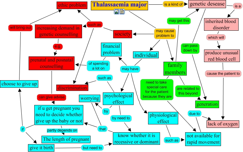 This Concept Map, created with IHMC CmapTools, has information related to: FirstProblemMap1, genetic desease can pass down by generation, society such as increasing demand in genetic counselling, family members are related to this beyond generation, choose to give up will bring out ethic problem, society such as ethic problem, psychological effect such as discrimination, individual may have financial problem, Thalassaemia major is a kind of genetic desease, genetic desease is a inherited blood disorder, produce unusual red blood cell cause the patient to lack of oxygen, individual may have physiological effect, prenatal and posnatal counselling can give advise if u get pregnant you need to decide whether give up the baby or not, family members need to take special care for the patient because they are not available for rapid movement, individual may have psychological effect, Thalassaemia major may cause problem to family members, Thalassaemia major may cause problem to society, not available for rapid movement due to lack of oxygen, if u get pregnant you need to decide whether give up the baby or not if choose to give up, psychological effect by worrying, psychological effect by need to know whether it is recessive or dominant