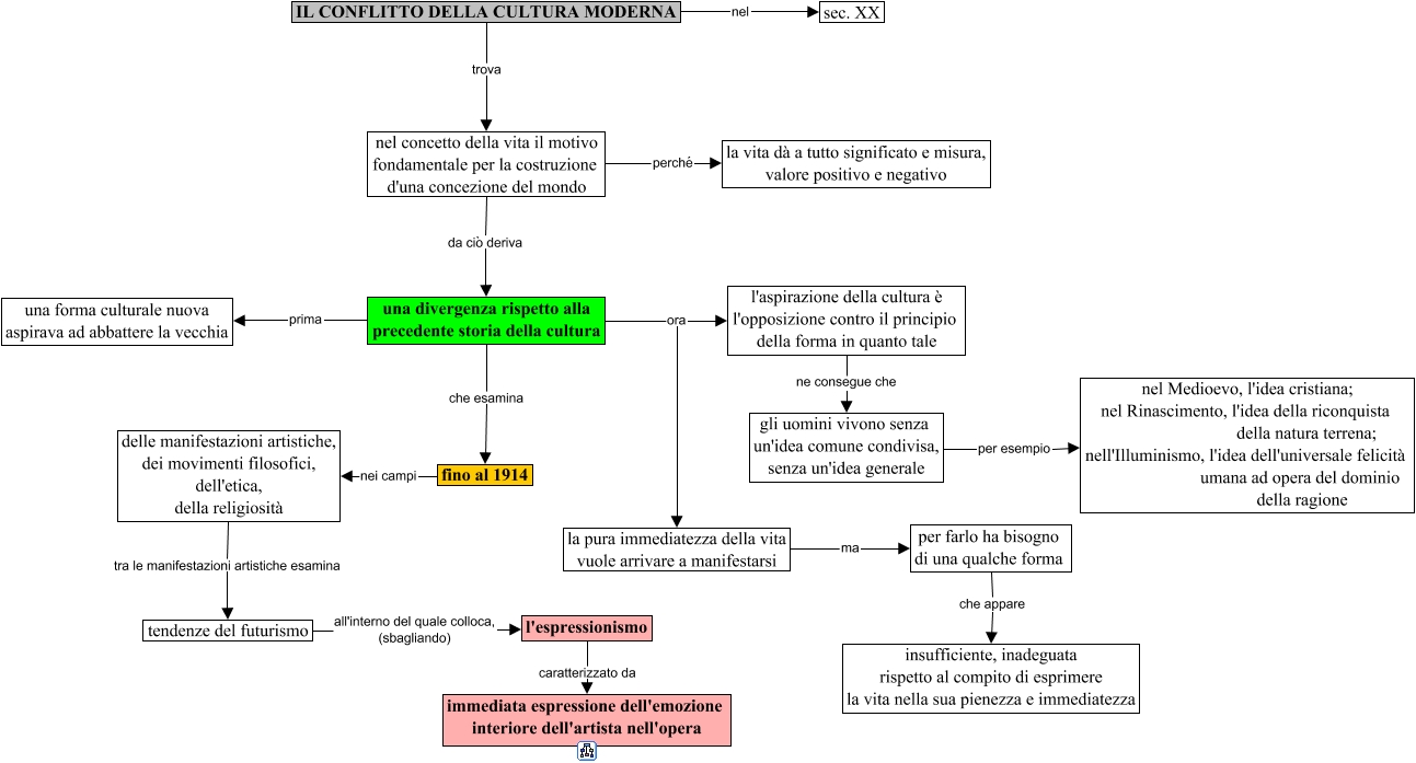 Questa Cmap, creata con IHMC CmapTools, contiene informazioni relative a: Simmel_vita e cultura, una divergenza rispetto alla precedente storia della cultura ora l'aspirazione della cultura è l'opposizione contro il principio della forma in quanto tale, nel concetto della vita il motivo fondamentale per la costruzione d'una concezione del mondo perché la vita dà a tutto significato e misura, valore positivo e negativo, IL CONFLITTO DELLA CULTURA MODERNA trova nel concetto della vita il motivo fondamentale per la costruzione d'una concezione del mondo, per farlo ha bisogno di una qualche forma che appare insufficiente, inadeguata rispetto al compito di esprimere la vita nella sua pienezza e immediatezza, nel concetto della vita il motivo fondamentale per la costruzione d'una concezione del mondo da ciò deriva una divergenza rispetto alla precedente storia della cultura, la pura immediatezza della vita vuole arrivare a manifestarsi ma per farlo ha bisogno di una qualche forma, una divergenza rispetto alla precedente storia della cultura prima una forma culturale nuova aspirava ad abbattere la vecchia, l'espressionismo caratterizzato da immediata espressione dell'emozione interiore dell'artista nell'opera, una divergenza rispetto alla precedente storia della cultura ora la pura immediatezza della vita vuole arrivare a manifestarsi, l'aspirazione della cultura è l'opposizione contro il principio della forma in quanto tale ne consegue che gli uomini vivono senza un'idea comune condivisa, senza un'idea generale, una divergenza rispetto alla precedente storia della cultura che esamina fino al 1914, IL CONFLITTO DELLA CULTURA MODERNA nel sec. XX, delle manifestazioni artistiche, dei movimenti filosofici, dell'etica, della religiosità tra le manifestazioni artistiche esamina tendenze del futurismo, gli uomini vivono senza un'idea comune condivisa, senza un'idea generale per esempio nel Medioevo, l'idea cristiana; nel Rinascimento, l'idea della riconquista della natura terrena; nell'Illuminismo, l'idea dell'universale felicità umana ad opera del dominio della ragione, tendenze del futurismo all'interno del quale colloca, (sbagliando) l'espressionismo, fino al 1914 nei campi delle manifestazioni artistiche, dei movimenti filosofici, dell'etica, della religiosità
