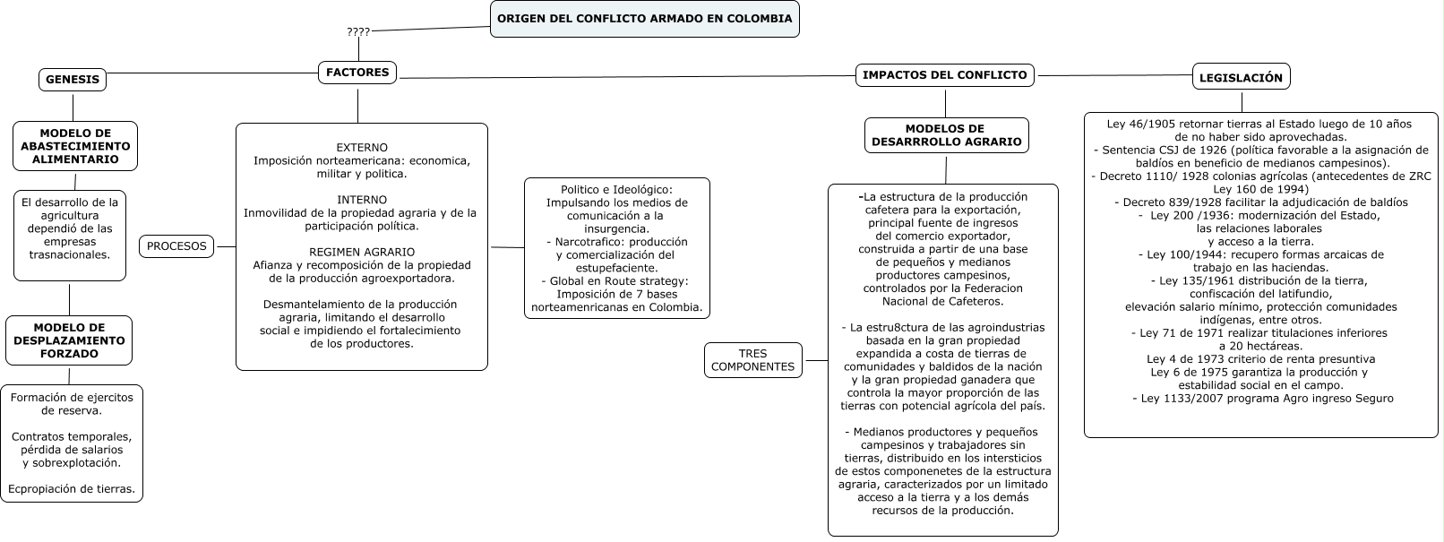 Este Cmap, tiene información relacionada con: staci's map, El desarrollo de la agricultura dependió de las empresas trasnacionales. ???? MODELO DE DESPLAZAMIENTO FORZADO, GENESIS ???? FACTORES, IMPACTOS DEL CONFLICTO ???? LEGISLACIÓN, LEGISLACIÓN ???? Ley 46/1905 retornar tierras al Estado luego de 10 años de no haber sido aprovechadas. - Sentencia CSJ de 1926 (política favorable a la asignación de baldíos en beneficio de medianos campesinos). - Decreto 1110/ 1928 colonias agrícolas (antecedentes de ZRC Ley 160 de 1994) - Decreto 839/1928 facilitar la adjudicación de baldíos - Ley 200 /1936: modernización del Estado, las relaciones laborales y acceso a la tierra. - Ley 100/1944: recupero formas arcaicas de trabajo en las haciendas. - Ley 135/1961 distribución de la tierra, confiscación del latifundio, elevación salario mínimo, protección comunidades indígenas, entre otros. - Ley 71 de 1971 realizar titulaciones inferiores a 20 hectáreas. Ley 4 de 1973 criterio de renta presuntiva Ley 6 de 1975 garantiza la producción y estabilidad social en el campo. - Ley 1133/2007 programa Agro ingreso Seguro, EXTERNO Imposición norteamericana: economica, militar y politica. INTERNO Inmovilidad de la propiedad agraria y de la participación política. REGIMEN AGRARIO Afianza y recomposición de la propiedad de la producción agroexportadora. Desmantelamiento de la producción agraria, limitando el desarrollo social e impidiendo el fortalecimiento de los productores. ???? FACTORES, MODELO DE DESPLAZAMIENTO FORZADO ???? Formación de ejercitos de reserva. Contratos temporales, pérdida de salarios y sobrexplotación. Ecpropiación de tierras., MODELOS DE DESARRROLLO AGRARIO ???? -La estructura de la producción cafetera para la exportación, principal fuente de ingresos del comercio exportador, construida a partir de una base de pequeños y medianos productores campesinos, controlados por la Federacion Nacional de Cafeteros. - La estru8ctura de las agroindustrias basada en la gran propiedad expandida a costa de tierras de comunidades y baldidos de la nación y la gran propiedad ganadera que controla la mayor proporción de las tierras con potencial agrícola del país. - Medianos productores y pequeños campesinos y trabajadores sin tierras, distribuido en los intersticios de estos componenetes de la estructura agraria, caracterizados por un limitado acceso a la tierra y a los demás recursos de la producción., EXTERNO Imposición norteamericana: economica, militar y politica. INTERNO Inmovilidad de la propiedad agraria y de la participación política. REGIMEN AGRARIO Afianza y recomposición de la propiedad de la producción agroexportadora. Desmantelamiento de la producción agraria, limitando el desarrollo social e impidiendo el fortalecimiento de los productores. Politic Politico e Ideológico: Impulsando los medios de comunicación a la insurgencia. - Narcotrafico: producción y comercialización del estupefaciente. - Global en Route strategy: Imposición de 7 bases norteamenricanas en Colombia., GENESIS ???? MODELO DE ABASTECIMIENTO ALIMENTARIO, MODELO DE ABASTECIMIENTO ALIMENTARIO ???? El desarrollo de la agricultura dependió de las empresas trasnacionales., EXTERNO Imposición norteamericana: economica, militar y politica. INTERNO Inmovilidad de la propiedad agraria y de la participación política. REGIMEN AGRARIO Afianza y recomposición de la propiedad de la producción agroexportadora. Desmantelamiento de la producción agraria, limitando el desarrollo social e impidiendo el fortalecimiento de los productores. ???? PROCESOS, ORIGEN DEL CONFLICTO ARMADO EN COLOMBIA ???? IMPACTOS DEL CONFLICTO, -La estructura de la producción cafetera para la exportación, principal fuente de ingresos del comercio exportador, construida a partir de una base de pequeños y medianos productores campesinos, controlados por la Federacion Nacional de Cafeteros. - La estru8ctura de las agroindustrias basada en la gran propiedad expandida a costa de tierras de comunidades y baldidos de la nación y la gran propiedad ganadera que controla la mayor proporción de las tierras con potencial agrícola del país. - Medianos productores y pequeños campesinos y trabajadores sin tierras, distribuido en los intersticios de estos componenetes de la estructura agraria, caracterizados por un limitado acceso a la tierra y a los demás recursos de la producción. ???? TRES COMPONENTES, IMPACTOS DEL CONFLICTO ???? MODELOS DE DESARRROLLO AGRARIO