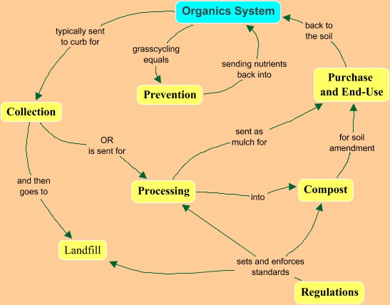 This Concept Map, created with IHMC CmapTools, has information related to: organics recycling system, Processing sent as mulch for Purchase and End-Use, Organics System typically sent to curb for Collection, Regulations sets and enforces standards Processing, Processing into Compost, Regulations sets and enforces standards Landfill, Prevention sending nutrients back into Organics System, Collection and then goes to Landfill, Compost for soil amendment Purchase and End-Use, Organics System grasscycling equals Prevention, Purchase and End-Use back to the soil Organics System, Collection OR is sent for Processing, Regulations sets and enforces standards Compost