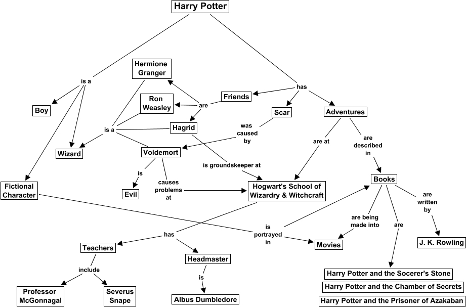 This Concept Map, created with IHMC CmapTools, has information related to: Harry Potter, Harry Potter has Scar, Scar was caused by Voldemort, Adventures are described in Books, Headmaster is Albus Dumbledore, Friends are Ron Weasley, Harry Potter is a Boy, Books are written by J. K. Rowling, Hogwart's School of Wizardry & Witchcraft has Headmaster, Fictional Character is portrayed in Books, Adventures are at Hogwart's School of Wizardry & Witchcraft, Voldemort causes problems at Hogwart's School of Wizardry & Witchcraft, Voldemort is a Wizard, Voldemort is Evil, Books are Harry Potter and the Socerer's Stone, Harry Potter has Friends, Hogwart's School of Wizardry & Witchcraft has Teachers, Ron Weasley is a Wizard, Teachers include Professor McGonnagal, Teachers include Severus Snape, Friends are Hermione Granger