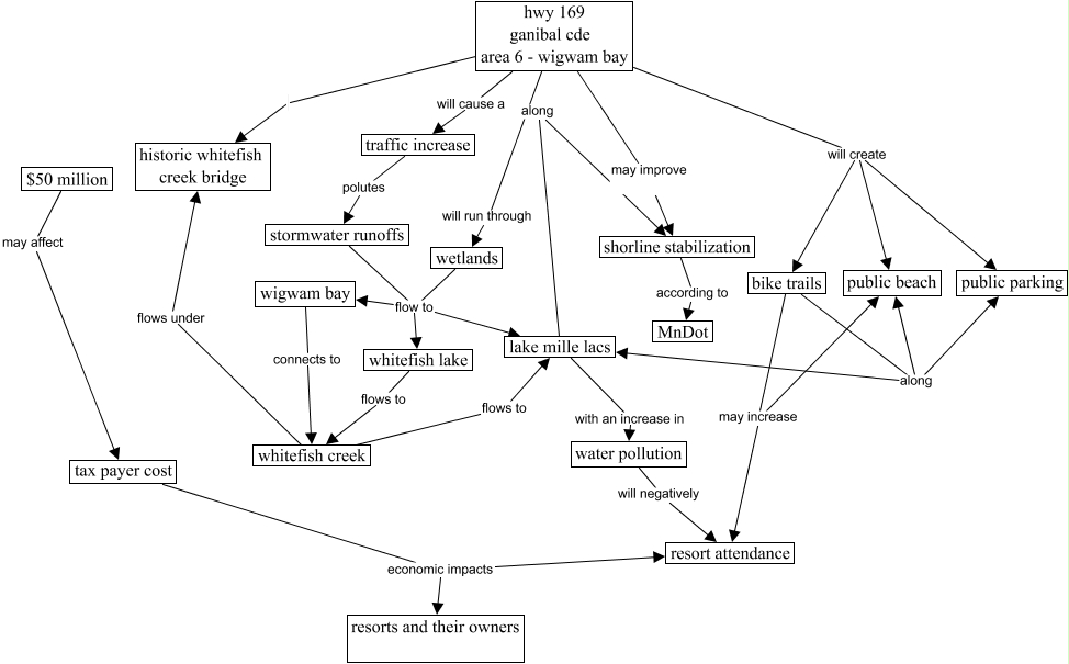 Este Cmap, tiene información relacionada con: hwy 159 improvements, bike trails along public parking, lake mille lacs along shorline stabilization, wigwam bay connects to whitefish creek, bike trails along public beach, whitefish lake flows to whitefish creek, tax payer cost economic impacts resort attendance, whitefish creek flows under historic whitefish creek bridge, whitefish creek flows to lake mille lacs, hwy 169 ganibal cde area 6 - wigwam bay will create public parking, wetlands flow to whitefish lake, hwy 169 ganibal cde area 6 - wigwam bay historic whitefish creek bridge, hwy 169 ganibal cde area 6 - wigwam bay may improve shorline stabilization, lake mille lacs with an increase in water pollution, tax payer cost economic impacts resorts and their owners, bike trails may increase resort attendance, bike trails along lake mille lacs, hwy 169 ganibal cde area 6 - wigwam bay will create bike trails, stormwater runoffs flow to wigwam bay, stormwater runoffs flow to lake mille lacs, shorline stabilization according to MnDot