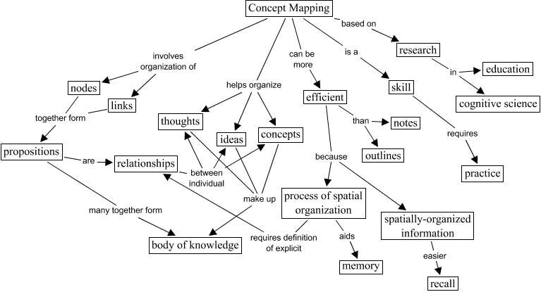 Este Cmap, tiene información relacionada con: Concept Mapping, process of spatial organization aids memory, Concept Mapping involves organization of nodes, process of spatial organization requires definition of explicit relationships, ideas make up body of knowledge, propositions many together form body of knowledge, efficient than outlines, relationships between individual ideas, relationships between individual thoughts, Concept Mapping can be more efficient, efficient because process of spatial organization, Concept Mapping based on research, concepts make up body of knowledge, propositions are relationships, skill requires practice, relationships between individual concepts, thoughts make up body of knowledge, research in cognitive science, Concept Mapping helps organize thoughts, research in education, efficient because spatially-organized information