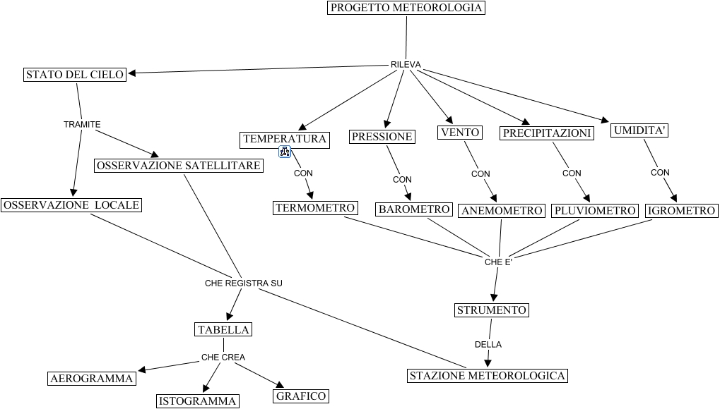 Questa Cmap, creata con IHMC CmapTools, contiene informazioni relative a: METEO, ANEMOMETRO CHE E' STRUMENTO, PROGETTO METEOROLOGIA RILEVA TEMPERATURA, TABELLA CHE CREA GRAFICO, PRESSIONE CON BAROMETRO, TERMOMETRO CHE E' STRUMENTO, STAZIONE METEOROLOGICA CHE REGISTRA SU TABELLA, IGROMETRO CHE E' STRUMENTO, STATO DEL CIELO TRAMITE OSSERVAZIONE LOCALE, OSSERVAZIONE LOCALE CHE REGISTRA SU TABELLA, BAROMETRO CHE E' STRUMENTO, PROGETTO METEOROLOGIA RILEVA VENTO, PROGETTO METEOROLOGIA RILEVA PRESSIONE, TEMPERATURA CON TERMOMETRO, TABELLA CHE CREA AEROGRAMMA, OSSERVAZIONE SATELLITARE CHE REGISTRA SU TABELLA, PROGETTO METEOROLOGIA RILEVA STATO DEL CIELO, PROGETTO METEOROLOGIA RILEVA PRECIPITAZIONI, PROGETTO METEOROLOGIA RILEVA UMIDITA', UMIDITA' CON IGROMETRO, PLUVIOMETRO CHE E' STRUMENTO