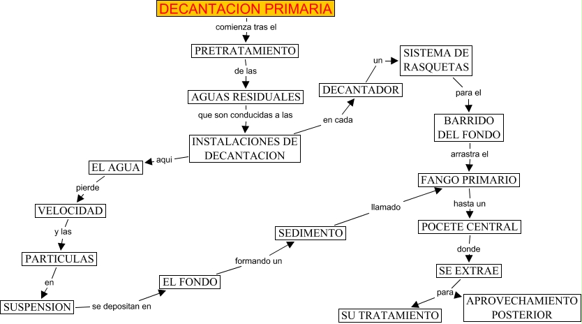 This Concept Map, created with IHMC CmapTools, has information related to: decantacion primaria, EL FONDO formando un SEDIMENTO, INSTALACIONES DE DECANTACION en cada DECANTADOR, SEDIMENTO llamado FANGO PRIMARIO, PRETRATAMIENTO de las AGUAS RESIDUALES, FANGO PRIMARIO hasta un POCETE CENTRAL, BARRIDO DEL FONDO arrastra el FANGO PRIMARIO, INSTALACIONES DE DECANTACION aqui EL AGUA, VELOCIDAD y las PARTICULAS, SE EXTRAE para APROVECHAMIENTO POSTERIOR, DECANTADOR un SISTEMA DE RASQUETAS, SISTEMA DE RASQUETAS para el BARRIDO DEL FONDO, SE EXTRAE para SU TRATAMIENTO, EL AGUA pierde VELOCIDAD, DECANTACION PRIMARIA comienza tras el PRETRATAMIENTO, AGUAS RESIDUALES que son conducidas a las INSTALACIONES DE DECANTACION, PARTICULAS en SUSPENSION, SUSPENSION se depositan en EL FONDO, POCETE CENTRAL donde SE EXTRAE