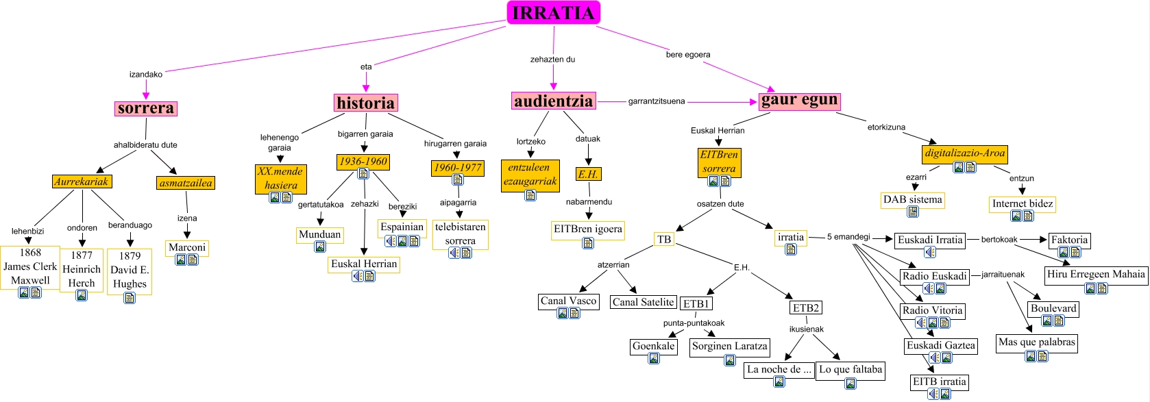 This Concept Map, created with IHMC CmapTools, has information related to: irratia, irratia 5 emandegi Radio Euskadi, TB E.H. ETB2, E.H. nabarmendu EITBren igoera, irratia 5 emandegi EITB irratia, irratia 5 emandegi Radio Vitoria, Euskadi Irratia bertokoak Faktoria, IRRATIA bere egoera gaur egun, TB atzerrian Canal Vasco, Radio Euskadi jarraituenak Boulevard, IRRATIA zehazten du audientzia, historia bigarren garaia 1936-1960, 1936-1960 gertatutakoa Munduan, sorrera ahalbideratu dute Aurrekariak, ETB1 punta-puntakoak Goenkale, Euskadi Irratia bertokoak Hiru Erregeen Mahaia, 1960-1977 aipagarria telebistaren sorrera, Aurrekariak beranduago 1879 David E. Hughes, TB atzerrian Canal Satelite, Radio Euskadi jarraituenak Mas que palabras, irratia 5 emandegi Euskadi Irratia