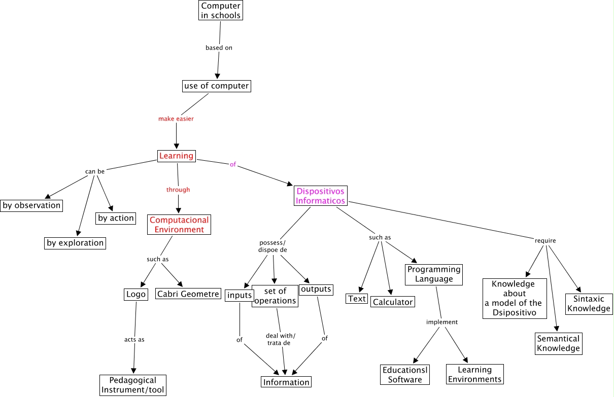 This Concept Map, created with IHMC CmapTools, has information related to: Chapter 1 of the Computer in Education's Book, Dispositivos Informaticos such as Programming Language, Dispositivos Informaticos possess/ dispoe de inputs, Learning can be by exploration, Dispositivos Informaticos require Sintaxic Knowledge, Learning can be by observation, inputs of Information, set of operations deal with/ trata de Information, Dispositivos Informaticos such as Calculator, Programming Language implement Educationsl Software, Dispositivos Informaticos require Semantical Knowledge, Logo acts as Pedagogical Instrument/tool, Programming Language implement Learning Environments, Dispositivos Informaticos possess/ dispoe de set of operations, Computacional Environment such as Cabri Geometre, outputs of Information, Dispositivos Informaticos possess/ dispoe de outputs, use of computer make easier Learning, Learning through Computacional Environment, Learning can be by action, Dispositivos Informaticos such as Text