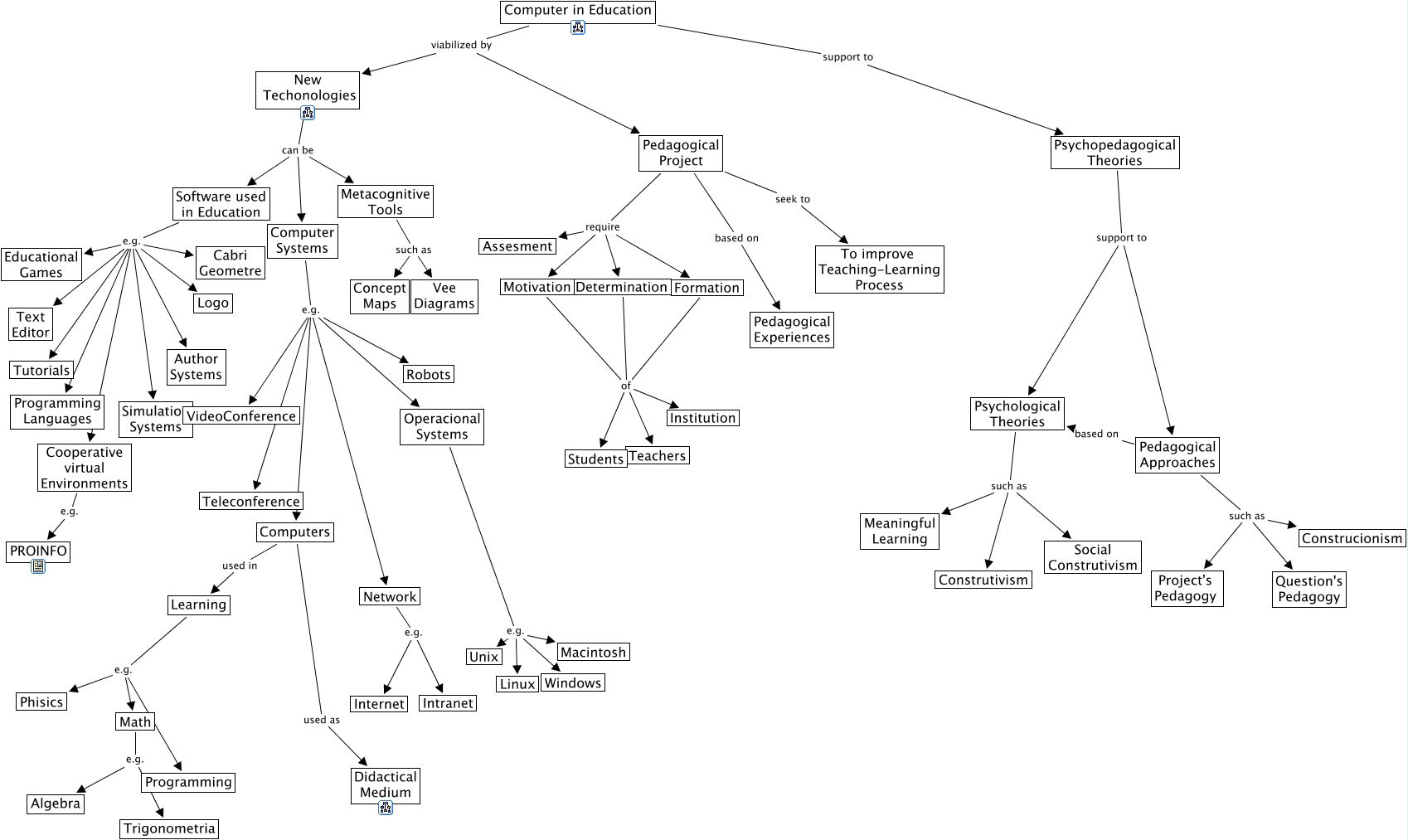 This Concept Map, created with IHMC CmapTools, has information related to: Computer in Educaton-0, Pedagogical Approaches such as Construcionism, Pedagogical Project based on Pedagogical Experiences, Determination of Teachers, New Techonologies can be Metacognitive Tools, Software used in Education e.g. Author Systems, Pedagogical Approaches such as Question's Pedagogy, Software used in Education e.g. Simulation Systems, Computer Systems e.g. Network, Computer Systems e.g. Teleconference, Pedagogical Project require Motivation, Pedagogical Approaches such as Project's Pedagogy, Computer Systems e.g. Computers, Formation of Students, Computer Systems e.g. VideoConference, Formation of Institution, Computer in Education support to Psychopedagogical Theories, Learning e.g. Math, Pedagogical Project require Formation, Metacognitive Tools such as Concept Maps, Pedagogical Project require Assesment