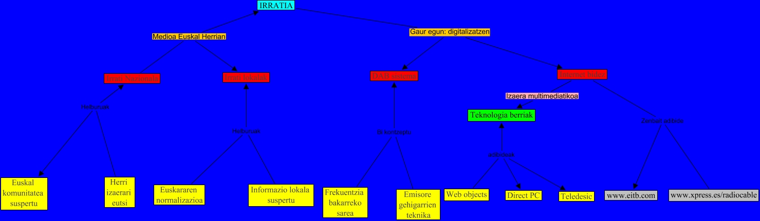 This Concept Map, created with IHMC CmapTools, has information related to: Irratia, Emisore gehigarrien teknika Bi kontzeptu DAB sistema, Euskararen normalizazioa Helburuak Irrati lokalak, IRRATIA Gaur egun: digitalizatzen DAB sistema, Internet bidez Zenbait adibide www.eitb.com, Web objects adibideak Teledesic, Herri izaerari eutsi Helburuak Euskal komunitatea suspertu, Informazio lokala suspertu Helburuak Irrati lokalak, IRRATIA Gaur egun: digitalizatzen Internet bidez, Irrati Nazionala Medioa Euskal Herrian IRRATIA, Web objects adibideak Direct PC, Frekuentzia bakarreko sarea Bi kontzeptu DAB sistema, Web objects adibideak Teknologia berriak, Internet bidez Izaera multimediatikoa Teknologia berriak, www.xpress.es/radiocable Zenbait adibide www.eitb.com, Irrati Nazionala Medioa Euskal Herrian Irrati lokalak, Herri izaerari eutsi Helburuak Irrati Nazionala