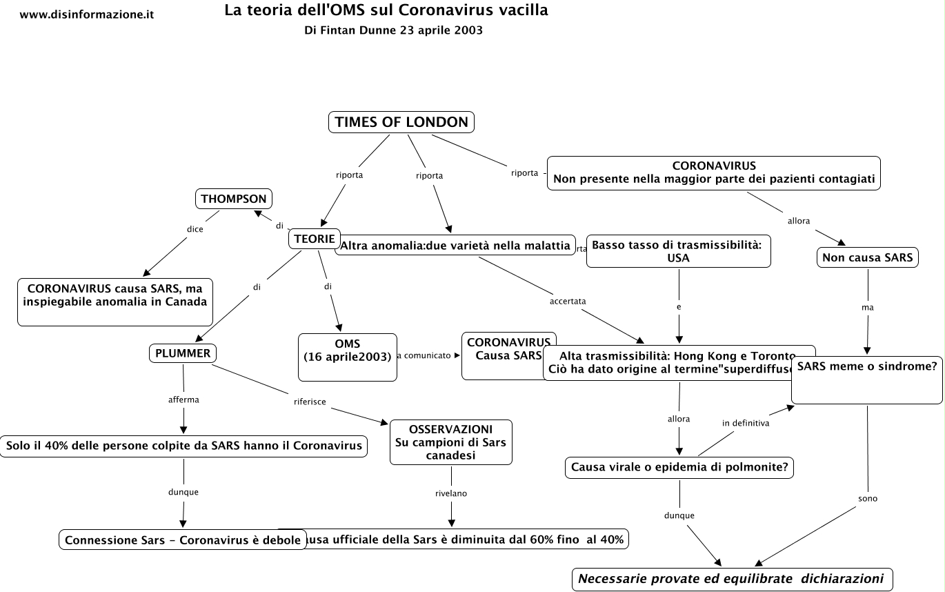 This Concept Map, created with IHMC CmapTools, has information related to: Sars, PLUMMER afferma Solo il 40% delle persone colpite da SARS hanno il Coronavirus, TIMES OF LONDON riporta CORONAVIRUS Non presente nella maggior parte dei pazienti contagiati, Causa virale o epidemia di polmonite? in definitiva SARS meme o sindrome?, OSSERVAZIONI Su campioni di Sars canadesi rivelano La causa ufficiale della Sars è diminuita dal 60% fino al 40%, Non causa SARS ma SARS meme o sindrome?, Solo il 40% delle persone colpite da SARS hanno il Coronavirus dunque Connessione Sars - Coronavirus è debole, TEORIE di THOMPSON, CORONAVIRUS Non presente nella maggior parte dei pazienti contagiati allora Non causa SARS, Alta trasmissibilità: Hong Kong e Toronto. Ciò ha dato origine al termine"superdiffusori" allora Causa virale o epidemia di polmonite?, TIMES OF LONDON riporta Altra anomalia:due varietà nella malattia, TIMES OF LONDON riporta TEORIE, TEORIE di PLUMMER, Causa virale o epidemia di polmonite? dunque Necessarie provate ed equilibrate dichiarazioni, TEORIE di OMS (16 aprile2003), PLUMMER riferisce OSSERVAZIONI Su campioni di Sars canadesi, Basso tasso di trasmissibilità: USA e Alta trasmissibilità: Hong Kong e Toronto. Ciò ha dato origine al termine"superdiffusori", THOMPSON dice CORONAVIRUS causa SARS, ma inspiegabile anomalia in Canada, OMS (16 aprile2003) ha comunicato CORONAVIRUS Causa SARS, Altra anomalia:due varietà nella malattia accertato Basso tasso di trasmissibilità: USA, SARS meme o sindrome? sono Necessarie provate ed equilibrate dichiarazioni