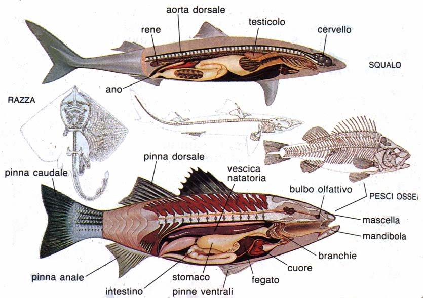 pesceIVBcompleto, pinne sono dorsale, lisca che fa da colonna vertebrale, branchie per respirare, organi escretori vescica, organi di senso occhi, organi come branchie, cervello è piccolo, organi come cervello, organi come cuore, organi di senso narici
