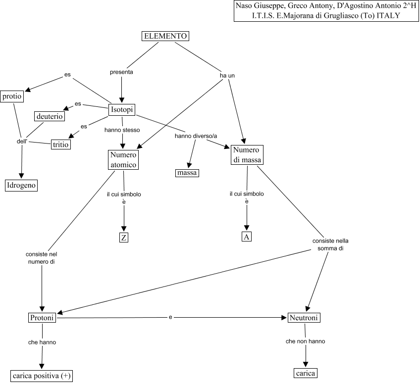 Questa Cmap, creata con IHMC CmapTools, contiene informazioni relative a: Elemento, ELEMENTO ha un Numero atomico, protio dell' Idrogeno, Isotopi hanno stesso Numero atomico, Protoni che hanno carica positiva (+), Neutroni che non hanno carica, Numero di massa il cui simbolo è A, Numero di massa consiste nella somma di Protoni, Isotopi hanno diverso/a Numero di massa, Numero atomico il cui simbolo è Z, ELEMENTO ha un Numero di massa, Protoni e Neutroni, Numero di massa consiste nella somma di Neutroni, Isotopi es deuterio, ELEMENTO presenta Isotopi, Isotopi es protio, deuterio dell' Idrogeno, Isotopi es tritio, tritio dell' Idrogeno, Isotopi hanno diverso/a massa, Numero atomico consiste nel numero di Protoni