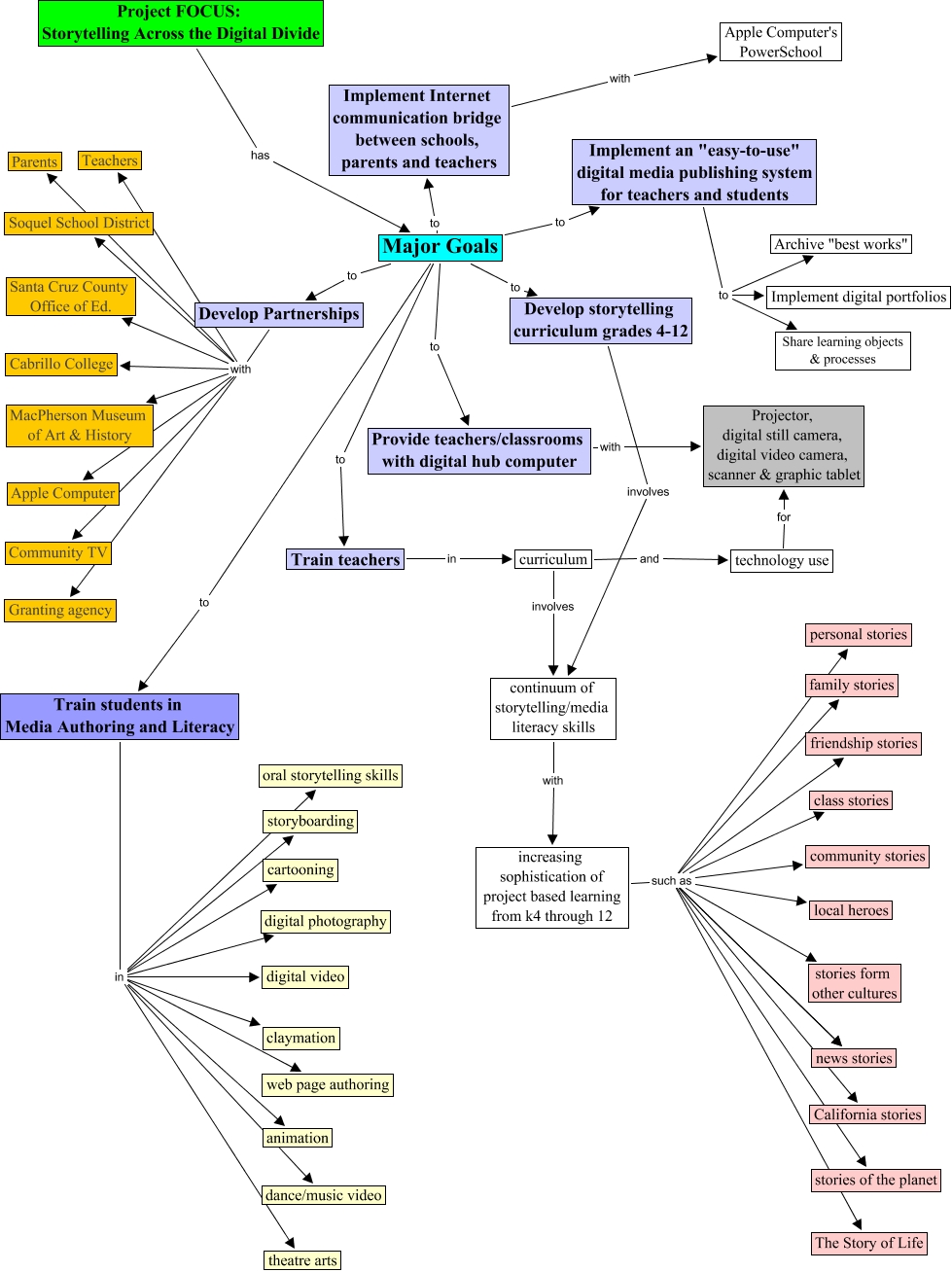 Project_FOCUS__Storytelling_Across_Digital_Divide, Train students in Media Authoring and Literacy in dance/music video, increasing sophistication of project based learning from k4 through 12 such as California stories, Major Goals to Provide teachers/classrooms with digital hub computer, Develop Partnerships with Parents, increasing sophistication of project based learning from k4 through 12 such as community stories, Implement an "easy-to-use" digital media publishing system for teachers and students to Share learning objects & processes, Train students in Media Authoring and Literacy in cartooning, Train students in Media Authoring and Literacy in oral storytelling skills, Develop storytelling curriculum grades 4-12 involves continuum of storytelling/media literacy skills, Develop Partnerships with Santa Cruz County Office of Ed.