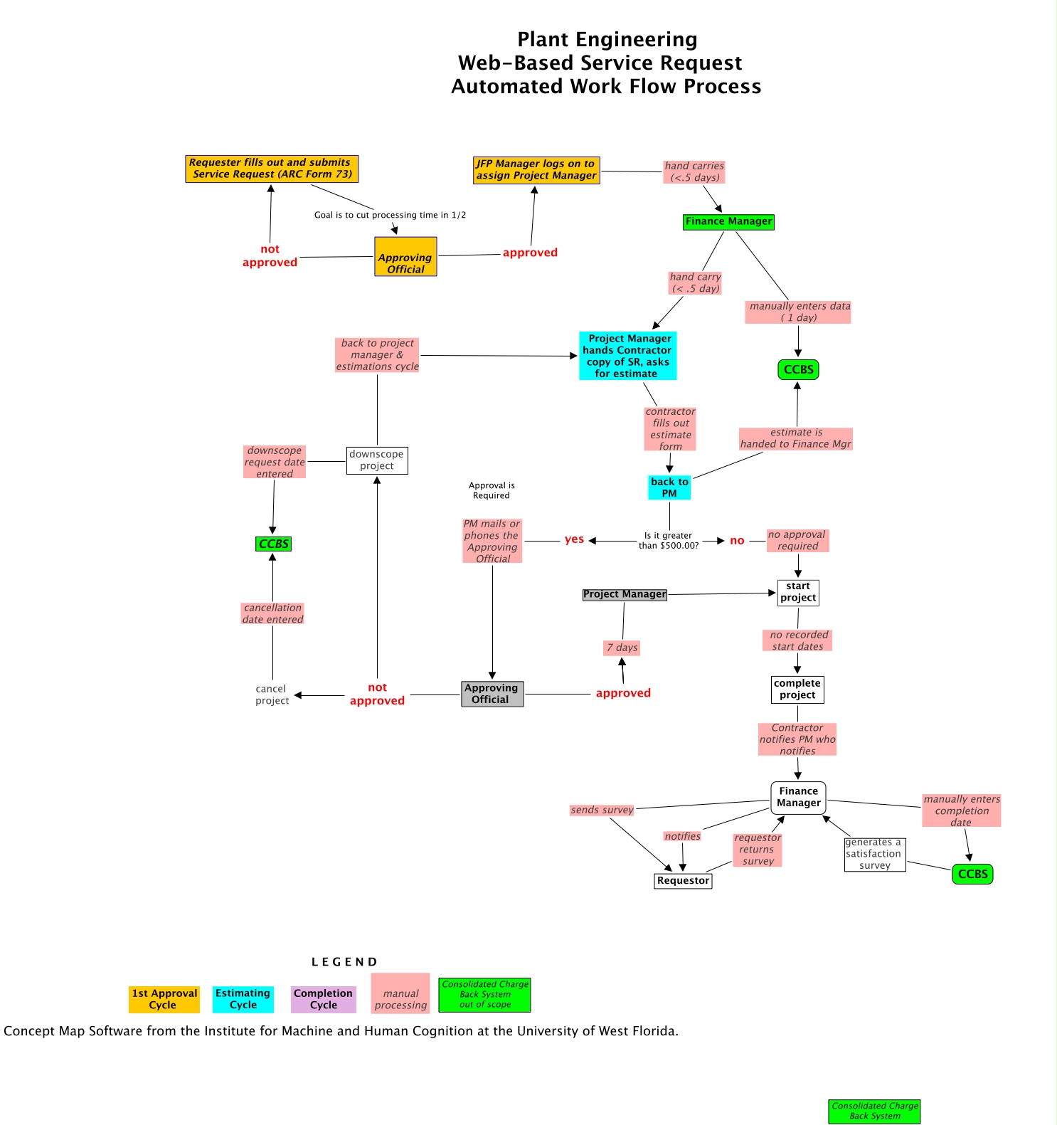 jfpSR - future, Finance Manager manually enters completion date CCBS, downscope project back to project manager & estimations cycle Project Manager hands Contractor copy of SR, asks for estimate, Project Manager hands Contractor copy of SR, asks for estimate contractor fills out estimate form back to PM, Approving Official not approved Requester fills out and submits Service Request (ARC Form 73), back to PM Is it greater than $500.00? no, Finance Manager notifies Requestor, no no approval required start project, complete project Contractor notifies PM who notifies Finance Manager, Finance Manager sends survey Requestor, Approving Official approved 7 days