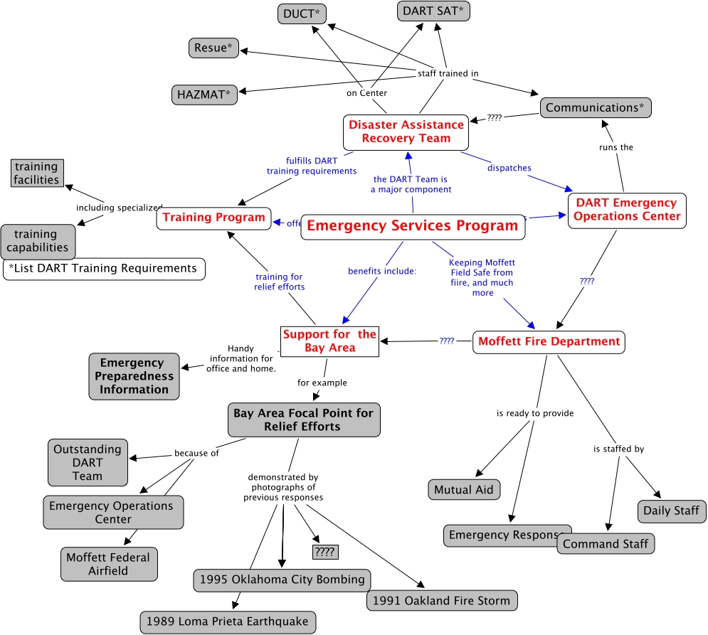 ESP, Communications* ???? Disaster Assistance Recovery Team, Bay Area Focal Point for Relief Efforts demonstrated by photographs of previous responses 1995 Oklahoma City Bombing, Disaster Assistance Recovery Team on Center DUCT*, Bay Area Focal Point for Relief Efforts demonstrated by photographs of previous responses 1991 Oakland Fire Storm, Disaster Assistance Recovery Team staff trained in Communications*, Emergency Services Program the DART Team is a major component Disaster Assistance Recovery Team, Emergency Services Program runs DART Emergency Operations Center, Moffett Fire Department is ready to provide Emergency Response, Disaster Assistance Recovery Team staff trained in DUCT*, Disaster Assistance Recovery Team staff trained in HAZMAT*