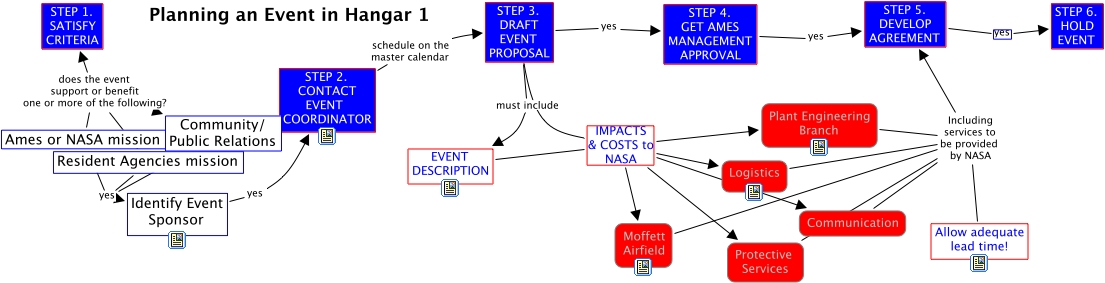Special_Events_in_HangarOne, STEP 5. DEVELOP AGREEMENT yes STEP 6. HOLD EVENT, STEP 3. DRAFT EVENT PROPOSAL IMPACTS & COSTS to NASA Communication, Moffett Airfield Including services to be provided by NASA STEP 5. DEVELOP AGREEMENT, Protective Services Including services to be provided by NASA STEP 5. DEVELOP AGREEMENT, EVENT DESCRIPTION IMPACTS & COSTS to NASA Protective Services, STEP 2. CONTACT EVENT COORDINATOR schedule on the master calendar STEP 3. DRAFT EVENT PROPOSAL, Community/ Public Relations yes Identify Event Sponsor, STEP 3. DRAFT EVENT PROPOSAL IMPACTS & COSTS to NASA Plant Engineering Branch, Communication Including services to be provided by NASA STEP 5. DEVELOP AGREEMENT, Ames or NASA mission does the event support or benefit one or more of the following? Resident Agencies mission