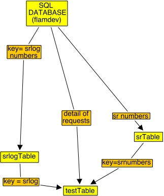 _SQL Tables_, SQL DATABASE (flamdev) key= srlog numbers srlogTable, srTable key=srnumbers testTable, SQL DATABASE (flamdev) sr numbers srTable, SQL DATABASE (flamdev) detail of requests testTable, srlogTable key = srlog testTable