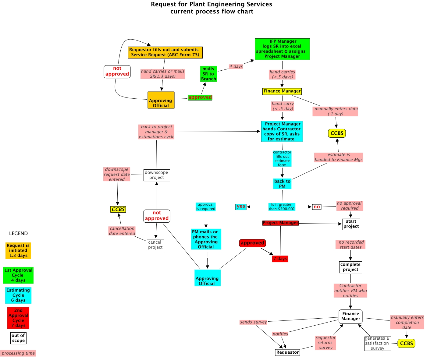 jfp SR, downscope project back to project manager & estimations cycle Project Manager hands Contractor copy of SR, asks for estimate, Approving Official not approved downscope project, Approving Official approved mails SR to Branch, Finance Manager manually enters data ( 1 day) CCBS, no no approval required start project, Requestor fills out and submits Service Request (ARC Form 73) hand carries or mails SR(1.3 days) Approving Official, Approving Official not approved cancel project, Approving Official approved 7 days, back to PM Is it greater than $500.00? yes, 7 days Project Manager start project