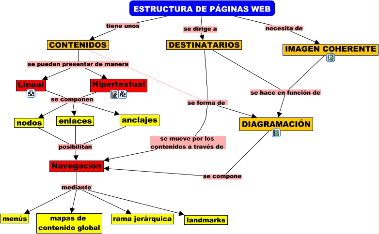 Questa Cmap, creata con IHMC CmapTools, contiene informazioni relative a: PAGINAS WEB, Navegación mediante menús, CONTENIDOS se pueden presentar de manera Lineal, ESTRUCTURA DE PÁGINAS WEB tiene unos CONTENIDOS, ESTRUCTURA DE PÁGINAS WEB se dirige a DESTINATARIOS, Hipertextual se componen anclajes, CONTENIDOS se pueden presentar de manera Hipertextual, DESTINATARIOS se hace en función de DIAGRAMACIÓN, Navegación mediante landmarks, Lineal se componen anclajes, Navegación mediante rama jerárquica, ESTRUCTURA DE PÁGINAS WEB necesita de IMAGEN COHERENTE, Hipertextual se componen enlaces, IMAGEN COHERENTE se hace en función de DIAGRAMACIÓN, Lineal se componen nodos, Hipertextual se componen nodos, enlaces posibilitan Navegación, anclajes posibilitan Navegación, CONTENIDOS se forma de DIAGRAMACIÓN, DESTINATARIOS se mueve por los contenidos a través de Navegación, Lineal se componen enlaces