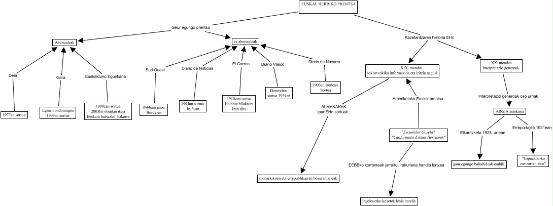 This Concept Map, created with IHMC CmapTools, has information related to: Euskal Herriko Prentsa, XX. mendea Interpretazio generoak Interpretazio generoak oso urriak ARGIA astekaria, "Escualdun Gaseta" "Californiako Eskual Herrikoak" Ameriketako Euskal prentsa XIX. mendea tokian tokiko informazioa eta iritzia nagusi, 1944ean jaioa Bordelen Sud Ouest ez abertzaleak, 1903an Iruñean Sortua Diario de Navarra ez abertzaleak, 1990ean sortua 2003ko otsailan itxia Euskara hutsezko bakarra Euskalduno Egunkaria Abertzaleak, EUSKAL HERRIKO PRENTSA Geur egungo prentsa ez abertzaleak, 1977an sortua Deia Abertzaleak, ARGIA astekaria Elkarrizketa 1925. urtean gaur egungo baliabideak erabili, Eginen ondorengoa 1999an sortua Gara Abertzaleak, "Escualdun Gaseta" "Californiako Eskual Herrikoak" EEBBko korronteak jarraitu: irakurleria handia lortzea ingelesezko kazetek lehia handia, 1910ean sortua Hainbat bilakaera izan ditu El Correo ez abertzaleak, EUSKAL HERRIKO PRENTSA Geur egungo prentsa Abertzaleak, ARGIA astekaria Erreportajea 1921ean "Gipuzkoa-ko zar-zarren alde", XIX. mendea tokian tokiko informazioa eta iritzia nagusi ALMANAKAK Ipar EHn sortuak monarkikoen eta errepublikarren bozeramaileak, EUSKAL HERRIKO PRENTSA Kazetaritzaren historia EHn XIX. mendea tokian tokiko informazioa eta iritzia nagusi, Donostian sortua 1934an Diario Vasco ez abertzaleak, EUSKAL HERRIKO PRENTSA Kazetaritzaren historia EHn XX. mendea Interpretazio generoak, 1994an sortua Iruñean Diario de Noticias ez abertzaleak