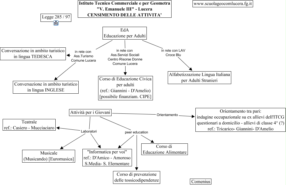 This Concept Map, created with IHMC CmapTools, has information related to: HomePage, EdA Educazione per Adulti in rete con Ass.Turismo Comune Lucera Conversazione in ambito turistico in lingua INGLESE, Attività per i Giovani Laboratori "Informatica per voi" ref.: D'Amico - Amoroso S.Media- S. Elementare, Attività per i Giovani Laboratori Musicale (Musicando) [Euromusica], Attività per i Giovani Orientamento Orientamento tra pari: indagine occupazionale su ex allievi dell'ITCG questionari a domicilio - allievi di classe 4° (?) ref.: Tricarico- Giannini- D'Amelio, Attività per i Giovani peer education "Informatica per voi" ref.: D'Amico - Amoroso S.Media- S. Elementare, Attività per i Giovani peer education Corso di Educazione Alimentare, EdA Educazione per Adulti in rete con Ass.Turismo Comune Lucera Conversazione in ambito turistico in lingua TEDESCA, Attività per i Giovani Laboratori Teatrale ref.: Casiero - Mucciaciaro, Attività per i Giovani peer education Corso di prevenzione delle tossicodipendenze, EdA Educazione per Adulti in rete con LAV Croce Blu Alfabetizzazione Lingua Italiana per Adulti Stranieri, EdA Educazione per Adulti in rete con Ass.Servizi Sociali Centro Risorse Donne Comune Lucera Corso di Educazione Civica per adulti (ref.: Giannini - D'Amelio) [possibile finanziam. CIPE]