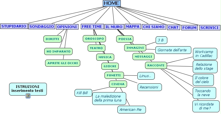 mappa giornalino gennaio, giornate dell'arte, recensioni, stupidario, poesia, oroscopo, american pie, aprite gli occhi, kill bill, il colore del cielo, il muro, chi siamo, opinioni, sondaggio, workcamp in cadillac, istruzioni inserimento testi, immagini, cinema, chat, racconti, musica, mappa, relazione dello stage, la maledizione della prima luna, fumetti, scrivici, toccando la neve, forum, messaggi, teatro, ho imparato, free time, linus.., diritti, vi ricordate di me?, giochi, 3 b, home