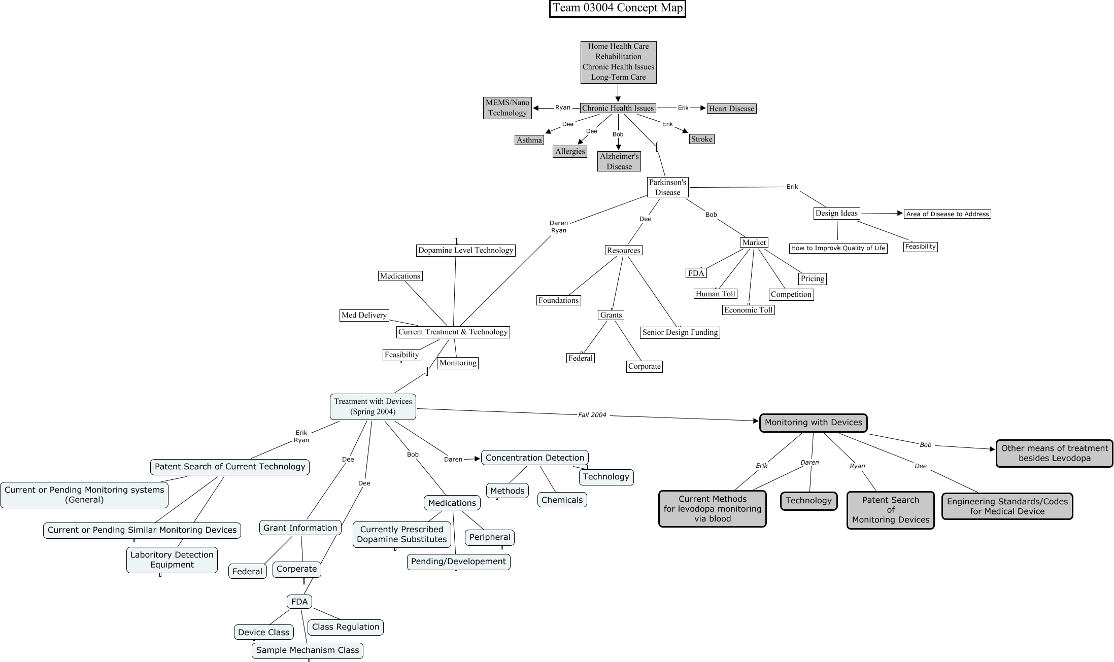 This Concept Map, created with IHMC CmapTools, has information related to: 03004 Fall 2004 Concept Map, Monitoring with Devices Daren Current Methods for levodopa monitoring via blood, Concentration Detection Technology, Parkinson's Disease Erik Design Ideas, Current Treatment & Technology Feasibility, Current Treatment & Technology Dopamine Level Technology, Market Pricing, Parkinson's Disease Daren Ryan Current Treatment & Technology, Resources Grants, Chronic Health Issues Bob Alzheimer's Disease, Market Competition, Current Treatment & Technology Medications, Concentration Detection Chemicals, Parkinson's Disease Bob Market, Grants Corporate, Market Human Toll, Treatment with Devices (Spring 2004) Daren Concentration Detection, Monitoring with Devices Bob Other means of treatment besides Levodopa, Concentration Detection Methods, Monitoring with Devices Dee Engineering Standards/Codes for Medical Device, Monitoring with Devices Ryan Patent Search of Monitoring Devices