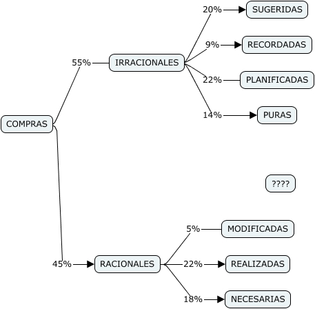 Este Cmap, tiene información relacionada con: Tipo de compras, RACIONALES 5% MODIFICADAS, COMPRAS 55% IRRACIONALES, IRRACIONALES 14% PURAS, IRRACIONALES 9% RECORDADAS, IRRACIONALES 22% PLANIFICADAS, IRRACIONALES 20% SUGERIDAS, RACIONALES 18% NECESARIAS, RACIONALES 22% REALIZADAS, COMPRAS 45% RACIONALES