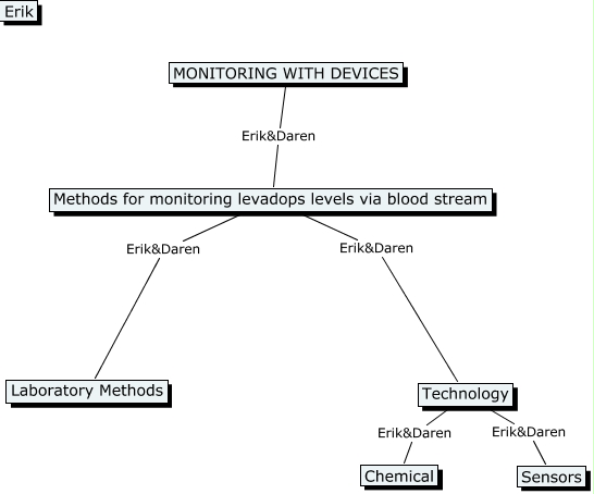 This Concept Map, created with IHMC CmapTools, has information related to: Erik_Fall04_Cmap, Methods for monitoring levadops levels via blood stream Erik&Daren Technology, Technology Erik&Daren Sensors, Methods for monitoring levadops levels via blood stream Erik&Daren Laboratory Methods, Technology Erik&Daren Chemical, MONITORING WITH DEVICES Erik&Daren Methods for monitoring levadops levels via blood stream