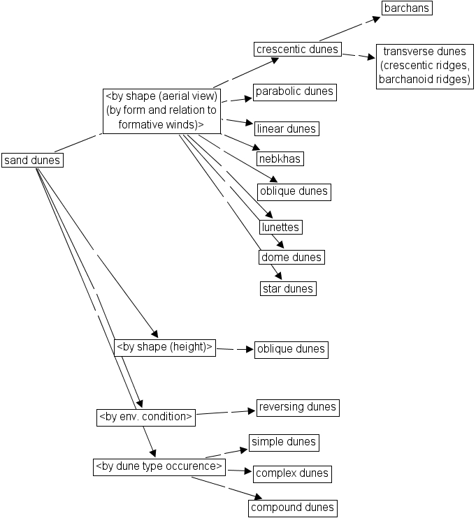 sand dune thesaurus, reversing dunes, crescentic dunes, barchans, lunettes, sand dunes, complex dunes, oblique dunes, simple dunes, nebkhas, dome dunes, compound dunes, by env. condition , parabolic dunes, by dune type occurence , transverse dunes (crescentic ridges, barchanoid ridges), star dunes, by shape (aerial view) (by form and relation to formative winds) , oblique dunes, linear dunes, by shape (height)