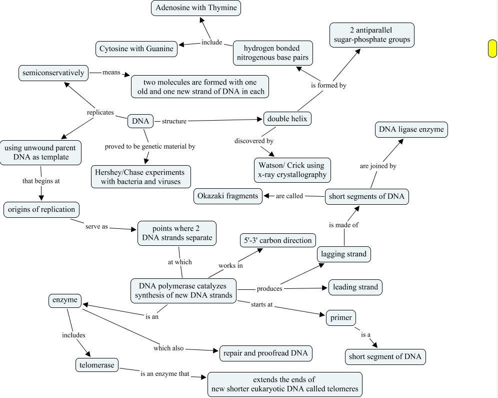 This Concept Map, created with IHMC CmapTools, has information related to: chapter 16, short segments of DNA are joined by DNA ligase enzyme, hydrogen bonded nitrogenous base pairs include Cytosine with Guanine, short segments of DNA are called Okazaki fragments, DNA replicates semiconservatively, DNA polymerase catalyzes synthesis of new DNA strands produces leading strand, DNA proved to be genetic material by Hershey/Chase experiments with bacteria and viruses, double helix is formed by 2 antiparallel sugar-phosphate groups, DNA structure double helix, origins of replication serve as points where 2 DNA strands separate, DNA polymerase catalyzes synthesis of new DNA strands is an enzyme, lagging strand is made of short segments of DNA, DNA polymerase catalyzes synthesis of new DNA strands produces lagging strand, DNA polymerase catalyzes synthesis of new DNA strands starts at primer, enzyme which also repair and proofread DNA, telomerase is an enzyme that extends the ends of new shorter eukaryotic DNA called telomeres, points where 2 DNA strands separate at which DNA polymerase catalyzes synthesis of new DNA strands, semiconservatively means two molecules are formed with one old and one new strand of DNA in each, enzyme includes telomerase, DNA polymerase catalyzes synthesis of new DNA strands works in 5'-3' carbon direction, double helix discovered by Watson/ Crick using x-ray crystallography
