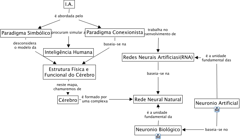 This Concept Map, created with IHMC CmapTools, has information related to: Introdução_Redes_Neurais, Cérebro é formado por uma complexa Rede Neural Natural, I.A. é abordada pelo Paradigma Simbólico, Redes Neurais Artificiasi(RNA) baseia-se na Rede Neural Natural, Paradigma Simbólico desconsidera o modelo da Estrutura Física e Funcional do Cérebro, I.A. é abordada pelo Paradigma Conexionista, Neuronio Artificial é a unidade fundamental das Redes Neurais Artificiasi(RNA), Paradigma Conexionista baseia-se na Estrutura Física e Funcional do Cérebro, Neuronio Biológico é a unidade fundamental da Rede Neural Natural, Paradigma Simbólico procuram simular a Inteligência Humana, Paradigma Conexionista trabalha no desenvolvimento de Redes Neurais Artificiasi(RNA), Estrutura Física e Funcional do Cérebro neste mapa, chamaremos de Cérebro, Paradigma Conexionista procuram simular a Inteligência Humana, Neuronio Artificial baseia-se no Neuronio Biológico