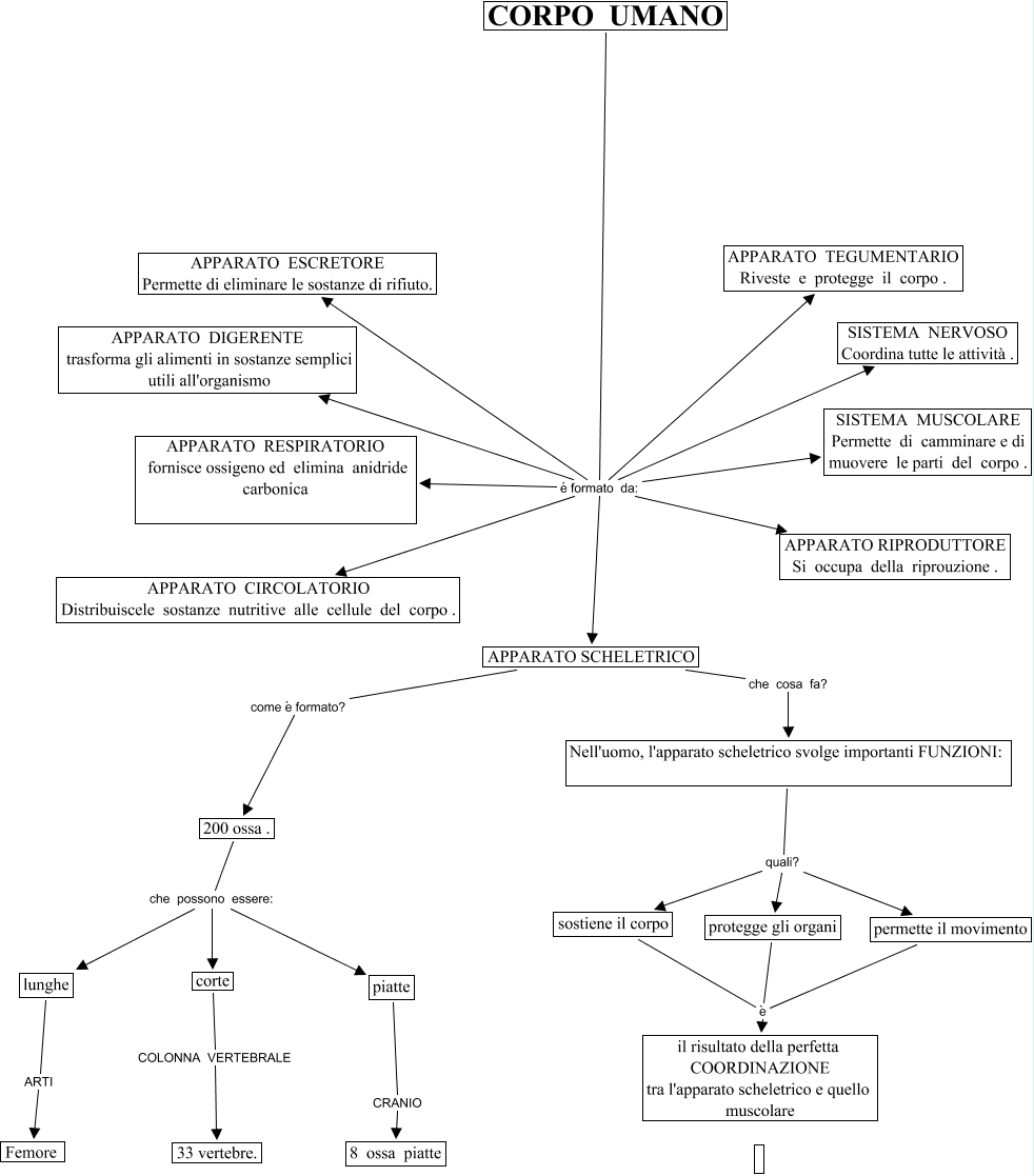 Questa Cmap, creata con IHMC CmapTools, contiene informazioni relative a: Marchese e Alessandro e Nicolò_dot, CORPO UMANO é formato da: SISTEMA NERVOSO Coordina tutte le attività ., protegge gli organi è il risultato della perfetta COORDINAZIONE tra l'apparato scheletrico e quello muscolare, CORPO UMANO é formato da: APPARATO CIRCOLATORIO Distribuiscele sostanze nutritive alle cellule del corpo ., 200 ossa . che possono essere: lunghe, permette il movimento è il risultato della perfetta COORDINAZIONE tra l'apparato scheletrico e quello muscolare, Nell'uomo, l'apparato scheletrico svolge importanti FUNZIONI: quali? sostiene il corpo, piatte CRANIO 8 ossa piatte, CORPO UMANO é formato da: APPARATO SCHELETRICO, CORPO UMANO é formato da: APPARATO DIGERENTE trasforma gli alimenti in sostanze semplici utili all'organismo, CORPO UMANO é formato da: APPARATO RIPRODUTTORE Si occupa della riprouzione ., Nell'uomo, l'apparato scheletrico svolge importanti FUNZIONI: quali? permette il movimento, Nell'uomo, l'apparato scheletrico svolge importanti FUNZIONI: quali? protegge gli organi, CORPO UMANO é formato da: SISTEMA MUSCOLARE Permette di camminare e di muovere le parti del corpo ., sostiene il corpo è il risultato della perfetta COORDINAZIONE tra l'apparato scheletrico e quello muscolare, corte COLONNA VERTEBRALE 33 vertebre., APPARATO SCHELETRICO come è formato? 200 ossa ., lunghe ARTI Femore, CORPO UMANO é formato da: APPARATO TEGUMENTARIO Riveste e protegge il corpo ., CORPO UMANO é formato da: APPARATO ESCRETORE Permette di eliminare le sostanze di rifiuto., APPARATO SCHELETRICO che cosa fa? Nell'uomo, l'apparato scheletrico svolge importanti FUNZIONI: