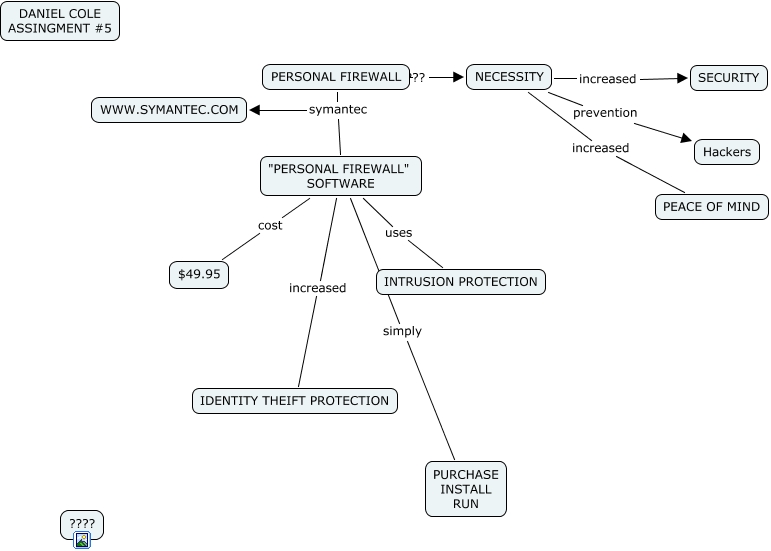 This Concept Map, created with IHMC CmapTools, has information related to: Daniel Cole - Personal Firewall, NECESSITY increased PEACE OF MIND, "PERSONAL FIREWALL" SOFTWARE simply PURCHASE INSTALL RUN, NECESSITY increased SECURITY, "PERSONAL FIREWALL" SOFTWARE increased IDENTITY THEIFT PROTECTION, PERSONAL FIREWALL symantec WWW.SYMANTEC.COM, PERSONAL FIREWALL ???? NECESSITY, PERSONAL FIREWALL symantec "PERSONAL FIREWALL" SOFTWARE, "PERSONAL FIREWALL" SOFTWARE cost $49.95, "PERSONAL FIREWALL" SOFTWARE uses INTRUSION PROTECTION, NECESSITY prevention Hackers