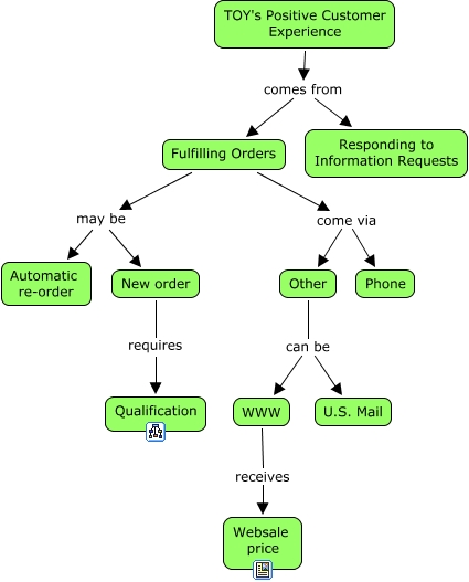 This Concept Map, created with IHMC CmapTools, has information related to: TOY's Positive Customer Experience, Fulfilling Orders come via Phone, TOY's Positive Customer Experience comes from Responding to Information Requests, Fulfilling Orders may be Automatic re-order, Other can be U.S. Mail, New order requires Qualification, WWW receives Websale price, Fulfilling Orders may be New order, TOY's Positive Customer Experience comes from Fulfilling Orders, Fulfilling Orders come via Other, Other can be WWW