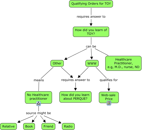 This Concept Map, created with IHMC CmapTools, has information related to: Qualifying Orders for Thinking of You, How did you learn of TOY? can be Healthcare Practitioner, e.g, M.D., nurse, ND, Qualifying Orders for TOY requires answer to How did you learn of TOY?, Other requires answer to How did you learn about PERQUE?, Other means No Healthcare practitioner, No Healthcare practitioner source might be Friend, How did you learn of TOY? can be Other, WWW qualifies for Web-sale Price, No Healthcare practitioner source might be Radio, No Healthcare practitioner source might be Relative, WWW requires answer to How did you learn about PERQUE?, No Healthcare practitioner source might be Book, How did you learn of TOY? can be WWW