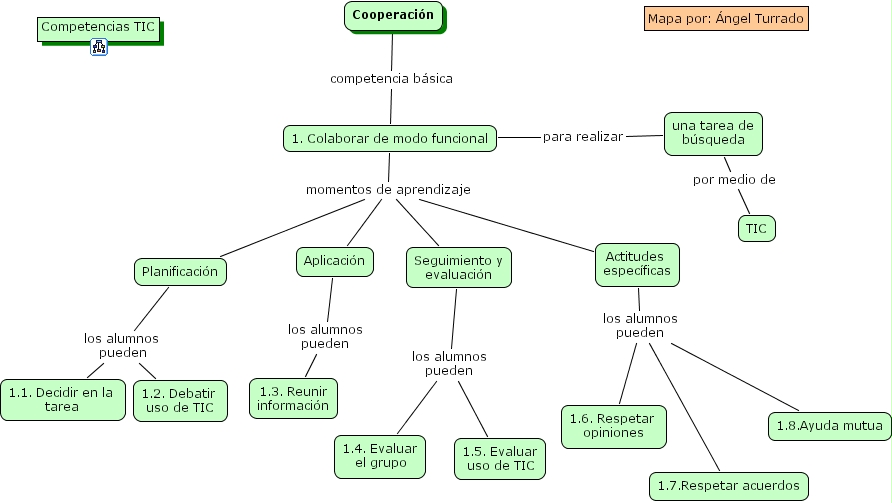 Aplicaci�n los alumnos pueden 1.3. Reunir informaci�n, 1. Colaborar de modo funcional momentos de aprendizaje Seguimiento y evaluaci�n, 1. Colaborar de modo funcional momentos de aprendizaje Aplicaci�n, 1. Colaborar de modo funcional momentos de aprendizaje Actitudes espec�ficas, 1. Colaborar de modo funcional momentos de aprendizaje Planificaci�n, Seguimiento y evaluaci�n los alumnos pueden 1.4. Evaluar el grupo, Seguimiento y evaluaci�n los alumnos pueden 1.5. Evaluar uso de TIC, 1. Colaborar de modo funcional para realizar una tarea de b�squeda, una tarea de b�squeda por medio de TIC, Actitudes espec�ficas los alumnos pueden 1.6. Respetar opiniones, Actitudes espec�ficas los alumnos pueden 1.7.Respetar acuerdos, Actitudes espec�ficas los alumnos pueden 1.8.Ayuda mutua, Cooperaci�n competencia b�sica 1. Colaborar de modo funcional, Planificaci�n los alumnos pueden 1.1. Decidir en la tarea, Planificaci�n los alumnos pueden 1.2. Debatir uso de TIC