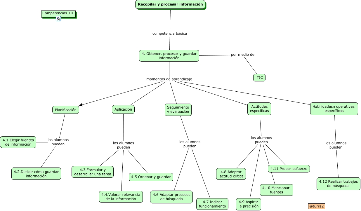 Este Cmap, tiene información relacionada con: 05 Procesar informacion, 4. Obtener, procesar y guardar información por medio de TIC, 4. Obtener, procesar y guardar información momentos de aprendizaje Habilidadesn operativas específicas, Seguimiento y evaluación los alumnos pueden 4.6 Adaptar procesos de búsqueda, Actitudes específicas los alumnos pueden 4.11 Probar esfuerzo, Actitudes específicas los alumnos pueden 4.8 Adoptar actitud crítica, Aplicación los alumnos pueden 4.5 Ordenar y guardar, Aplicación los alumnos pueden 4.3.Formular y desarrollar una tarea, 4. Obtener, procesar y guardar información momentos de aprendizaje Planificación, Habilidadesn operativas específicas los alumnos pueden 4.12 Realizar trabajos de búsqueda, Planificación los alumnos pueden 4.1.Elegir fuentes de información, Aplicación los alumnos pueden 4.4.Valorar relevancia de la información, 4. Obtener, procesar y guardar información momentos de aprendizaje Actitudes específicas, 4. Obtener, procesar y guardar información momentos de aprendizaje Seguimiento y evaluación, Actitudes específicas los alumnos pueden 4.9 Aspirar a precisión, Seguimiento y evaluación los alumnos pueden 4.7 Indicar funcionamiento, 4. Obtener, procesar y guardar información momentos de aprendizaje Aplicación, Planificación los alumnos pueden 4.2.Decidir cómo guardar información, Recopilar y procesar información competencia básica 4. Obtener, procesar y guardar información, Actitudes específicas los alumnos pueden 4.10 Mencionar fuentes
