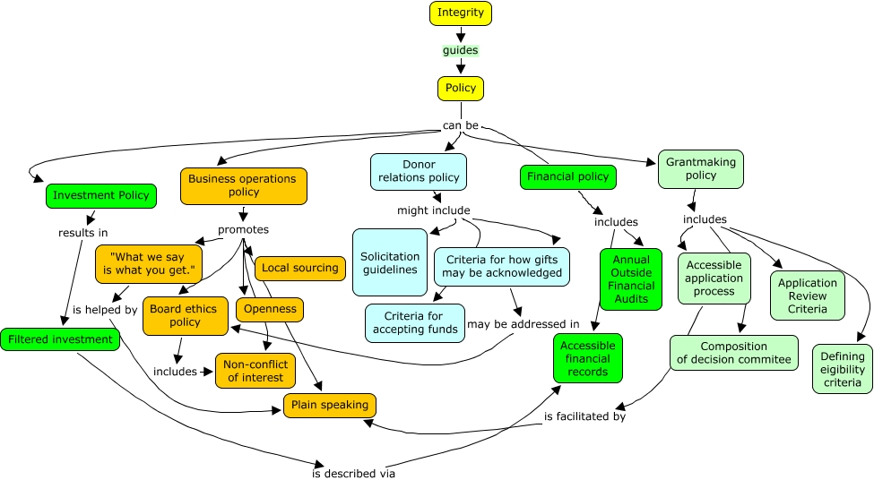 This Concept Map, created with IHMC CmapTools, has information related to: Integrity, Filtered investment is described via Accessible financial records, Business operations policy promotes Local sourcing, Investment Policy results in Filtered investment, Business operations policy promotes "What we say is what you get.", Policy can be Investment Policy, Grantmaking policy includes Defining eigibility criteria, Business operations policy promotes Plain speaking, Grantmaking policy includes Composition of decision commitee, Financial policy includes Accessible financial records, Financial policy includes Annual Outside Financial Audits, Donor relations policy might include Solicitation guidelines, Integrity guides Policy, Policy can be Donor relations policy, Policy can be Grantmaking policy, "What we say is what you get." is helped by Plain speaking, Business operations policy promotes Board ethics policy, Policy can be Business operations policy, Criteria for how gifts may be acknowledged may be addressed in Board ethics policy, Donor relations policy might include Criteria for how gifts may be acknowledged, Grantmaking policy includes Application Review Criteria