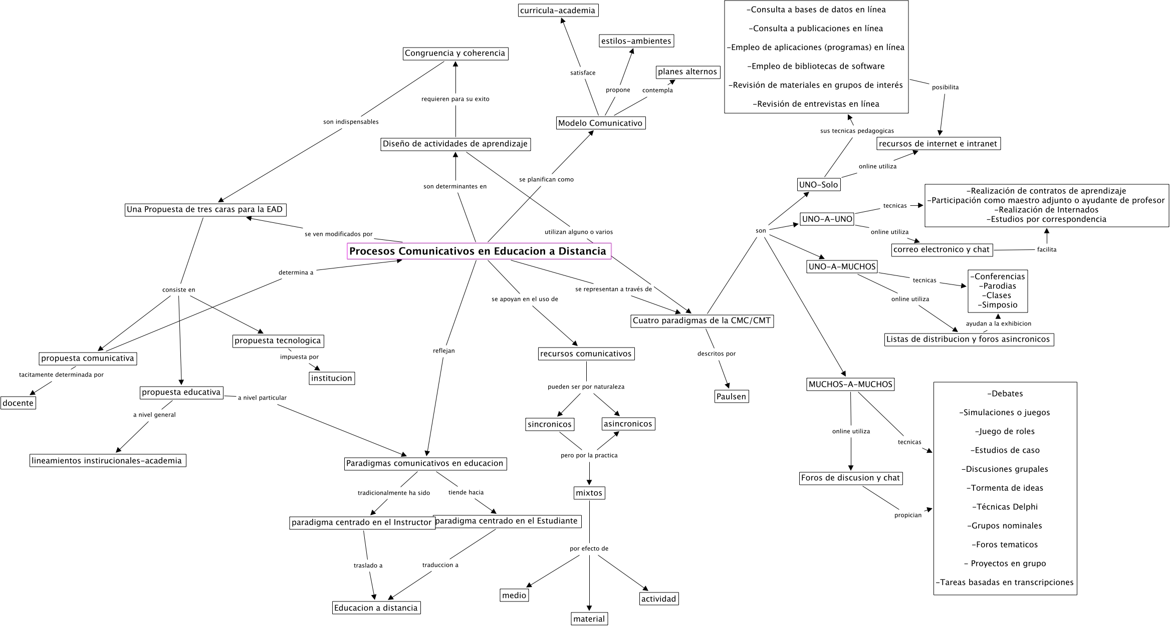 Este Cmap, tiene información relacionada con: Procesos Comunicativos, propuesta comunicativa tacitamente determinada por docente, mixtos por efecto de material, sincronicos pero por la practica asincronicos, Modelo Comunicativo propone estilos-ambientes, Procesos Comunicativos en Educacion a Distancia se ven modificados por Una Propuesta de tres caras para la EAD, Paradigmas comunicativos en educacion tradicionalmente ha sido paradigma centrado en el Instructor, propuesta comunicativa determina a Procesos Comunicativos en Educacion a Distancia, propuesta educativa a nivel particular Paradigmas comunicativos en educacion, MUCHOS-A-MUCHOS tecnicas -Debates -Simulaciones o juegos -Juego de roles -Estudios de caso -Discusiones grupales -Tormenta de ideas -Técnicas Delphi -Grupos nominales -Foros tematicos - Proyectos en grupo -Tareas basadas en transcripciones, Listas de distribucion y foros asincronicos ayudan a la exhibicion -Conferencias -Parodias -Clases -Simposio, Diseño de actividades de aprendizaje requieren para su exito Congruencia y coherencia, mixtos por efecto de medio, Procesos Comunicativos en Educacion a Distancia se apoyan en el uso de recursos comunicativos, Procesos Comunicativos en Educacion a Distancia se representan a través de Cuatro paradigmas de la CMC/CMT, Congruencia y coherencia son indispensables Una Propuesta de tres caras para la EAD, UNO-Solo sus tecnicas pedagogicas -Consulta a bases de datos en línea -Consulta a publicaciones en línea -Empleo de aplicaciones (programas) en línea -Empleo de bibliotecas de software -Revisión de materiales en grupos de interés -Revisión de entrevistas en línea, paradigma centrado en el Instructor traslado a Educacion a distancia, UNO-A-UNO online utiliza correo electronico y chat, Una Propuesta de tres caras para la EAD consiste en propuesta comunicativa, Foros de discusion y chat propician -Debates -Simulaciones o juegos -Juego de roles -Estudios de caso -Discusiones grupales -Tormenta de ideas -Técnicas Delphi -Grupos nominales -Foros tematicos - Proyectos en grupo -Tareas basadas en transcripciones