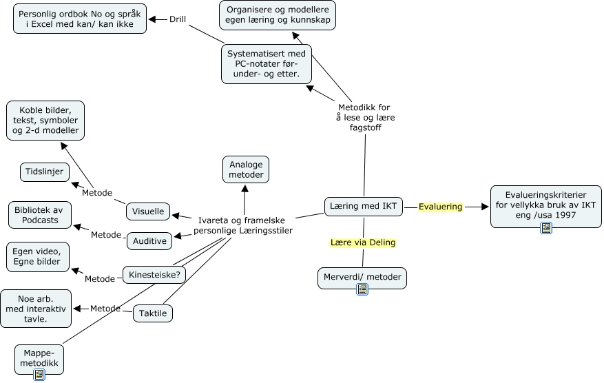 This Concept Map, created with IHMC CmapTools, has information related to: Ideer med ElevFokus, Læring med IKT Ivareta og framelske personlige Læringsstiler Analoge metoder, Læring med IKT Ivareta og framelske personlige Læringsstiler Visuelle, Læring med IKT Ivareta og framelske personlige Læringsstiler Kinesteiske?, Læring med IKT Metodikk for å lese og lære fagstoff Organisere og modellere egen læring og kunnskap, Systematisert med PC-notater før- under- og etter. Drill Personlig ordbok No og språk i Excel med kan/ kan ikke, Læring med IKT Ivareta og framelske personlige Læringsstiler Taktile, Kinesteiske? Metode Egen video, Egne bilder, Læring med IKT Lære via Deling Merverdi/ metoder, Visuelle Metode Tidslinjer, Læring med IKT Metodikk for å lese og lære fagstoff Systematisert med PC-notater før- under- og etter., Auditive Metode Bibliotek av Podcasts, Visuelle Metode Koble bilder, tekst, symboler og 2-d modeller, Læring med IKT Ivareta og framelske personlige Læringsstiler Auditive, Taktile Metode Noe arb. med interaktiv tavle., Læring med IKT Evaluering Evalueringskriterier for vellykka bruk av IKT eng /usa 1997, Læring med IKT Ivareta og framelske personlige Læringsstiler Mappe- metodikk