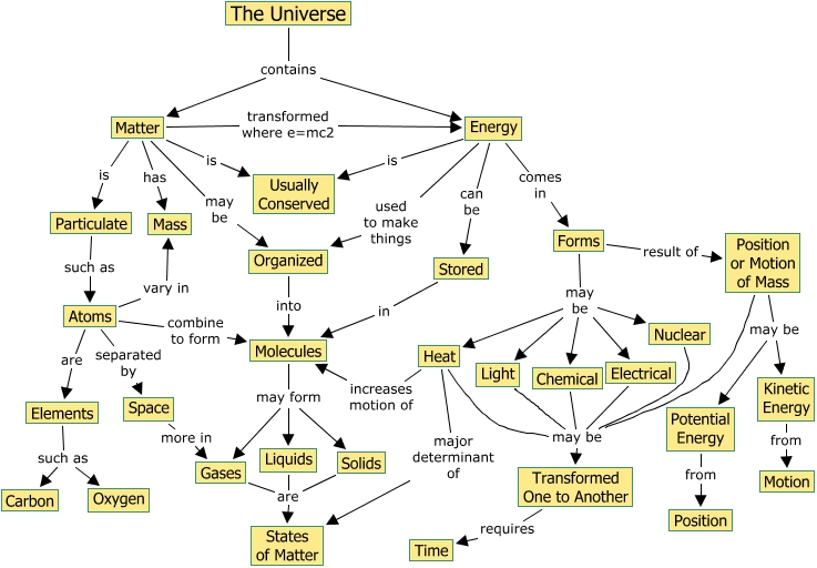 This Concept Map, created with IHMC CmapTools, has information related to: Universe, Electrical may be Transformed One to Another, Atoms are Elements, Forms may be Nuclear, Stored in Molecules, Energy used to make things Organized, Liquids are States of Matter, Molecules may form Solids, Position or Motion of Mass may be Kinetic Energy, Matter may be Organized, Atoms vary in Mass, Energy is Usually Conserved, The Universe contains Matter, Matter transformed where e=mc2 Energy, Particulate such as Atoms, The Universe contains Energy, Atoms combine to form Molecules, Nuclear may be Transformed One to Another, Atoms separated by Space, Position or Motion of Mass may be Transformed One to Another, Gases are States of Matter