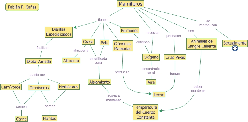 This Concept Map, created with IHMC CmapTools, has information related to: Mamíferos, Mamíferos tienen Dientes Especializados, Herbívoros comen Plantas, Dientes Especializados facilitan Dieta Variada, Mamíferos tienen Grasa, Crías Vivas toman Leche, Dieta Variada puede ser Omnívoros, Oxígeno encontrado en el Aire, Omnívoros comen Plantas, Pulmones obtienen Oxígeno, Grasa almacena Alimento, Glándulas Mamarias producen Leche, Grasa es utilizada para Aislamiento, Dieta Variada puede ser Carnívoros, Mamíferos se reproducen Sexualmente, Mamíferos tienen Pelo, Mamíferos tienen Pulmones, Omnívoros comen Carne, Dieta Variada puede ser Herbívoros, Mamíferos tienen Glándulas Mamarias, Pelo es utilizada para Aislamiento