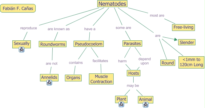 This Concept Map, created with IHMC CmapTools, has information related to: Nematodes, Nematodes most are Free-living, Nematodes are Slender, Nematodes are Round, Pseudocoelom facilitates Muscle Contraction, Parasites harm Hosts, Hosts may be Animal, Nematodes are əmm to 120cm Long, Pseudocoelom contains Organs, Hosts may be Plant, Parasites depend upon Hosts, Nematodes reproduce Sexually, Nematodes some are Parasites, Roundworms are not Annelids, Nematodes are known as Roundworms, Nematodes have a Pseudocoelom