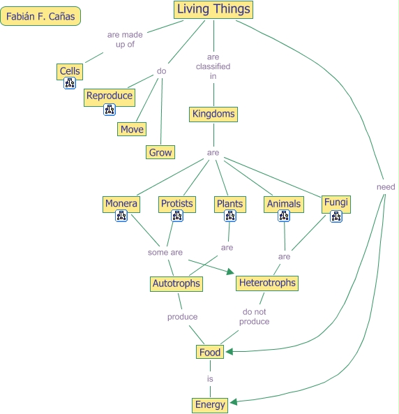 This Concept Map, created with IHMC CmapTools, has information related to: Living Things, Kingdoms are Protists, Fungi are Heterotrophs, Monera some are Heterotrophs, Kingdoms are Animals, Animals are Heterotrophs, Plants are Autotrophs, Kingdoms are Monera, Monera some are Autotrophs, Living Things are made up of Cells, Autotrophs produce Food, Living Things need Food, Kingdoms are Plants, Living Things need Energy, Food is Energy, Living Things do Grow, Heterotrophs do not produce Food, Living Things do Reproduce, Protists some are Heterotrophs, Living Things do Move, Living Things are classified in Kingdoms