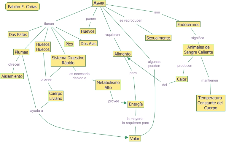 This Concept Map, created with IHMC CmapTools, has information related to: Aves, Aves tienen Huesos Huecos, Endotermos significa Animales de Sangre Caliente, Aves son Endotermos, Alimento para Energía, Huesos Huecos provee Cuerpo Liviano, Aves requieren Alimento, Calor del Alimento, Aves tienen Plumas, Plumas ayuda a Volar, Aves tienen Dos Alas, Aves tienen Sistema Digestivo Rápido, Aves algunas pueden Volar, Plumas ofrecen Aislamiento, Animales de Sangre Caliente producen Calor, Aves tienen Dos Patas, Sistema Digestivo Rápido es necesario debido a Metabolismo Alto, Animales de Sangre Caliente mantienen Temperatura Constante del Cuerpo, Metabolismo Alto provee Energía, Cuerpo Liviano ayuda a Volar, Aves se reproducen Sexualmente