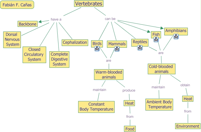 This Concept Map, created with IHMC CmapTools, has information related to: Vertebrates, Vertebrates have a Dorsal Nervous System, Vertebrates can be Birds, Vertebrates can be Reptiles, Vertebrates have a Complete Digestive System, Vertebrates have a Closed Circulatory System, Reptiles are Cold-blooded animals, Vertebrates have a Backbone, Vertebrates can be Mammals, Heat from Environment, Warm-blooded animals maintain Constant Body Temperature, Fish are Cold-blooded animals, Birds are Warm-blooded animals, Amphibians are Cold-blooded animals, Cold-blooded animals obtain Heat, Heat from Food, Vertebrates have a Cephalization, Vertebrates can be Fish, Vertebrates can be Amphibians, Mammals are Warm-blooded animals, Cold-blooded animals maintain Ambient Body Temperature