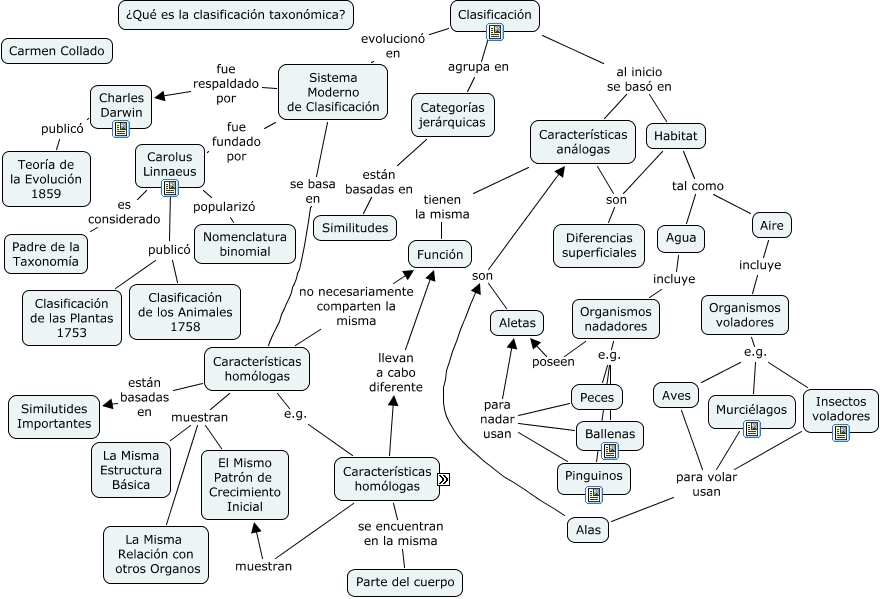 This Concept Map, created with IHMC CmapTools, has information related to: Clasificación, Sistema Moderno de Clasificación fue fundado por Carolus Linnaeus, Características homólogas están basadas en Similutides Importantes, Organismos nadadores e.g. Peces, Ballenas para nadar usan Aletas, Características homólogas e.g. Características homólogas, Características homólogas muestran La Misma Relación con otros Organos, Sistema Moderno de Clasificación se basa en Características homólogas, Carolus Linnaeus publicó Clasificación de las Plantas 1753, Aletas son Características análogas, Alas son Características análogas, Agua incluye Organismos nadadores, Habitat son Diferencias superficiales, Características análogas son Diferencias superficiales, Organismos voladores e.g. Murciélagos, Organismos nadadores e.g. Ballenas, Características homólogas se encuentran en la misma Parte del cuerpo, Aire incluye Organismos voladores, Características homólogas llevan a cabo diferente Función, Clasificación evolucionó en Sistema Moderno de Clasificación, Aves para volar usan Alas