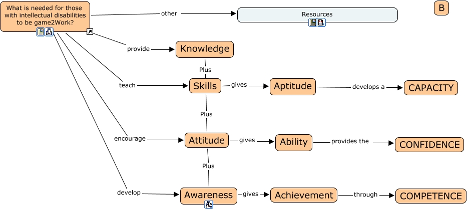 This Concept Map, created with IHMC CmapTools, has information related to: What is needed for those with intellectual disabilities to be game2Work, Knowledge Plus Skills, Aptitude develops a CAPACITY, Awareness gives Achievement, What is needed for those with intellectual disabilities to be game2Work? provide Knowledge, What is needed for those with intellectual disabilities to be game2Work? encourage Attitude, Ability provides the CONFIDENCE, Attitude gives Ability, What is needed for those with intellectual disabilities to be game2Work? teach Skills, Skills gives Aptitude, Skills Plus Attitude, What is needed for those with intellectual disabilities to be game2Work? other Resources, Attitude Plus Awareness, Achievement through COMPETENCE, What is needed for those with intellectual disabilities to be game2Work? develop Awareness